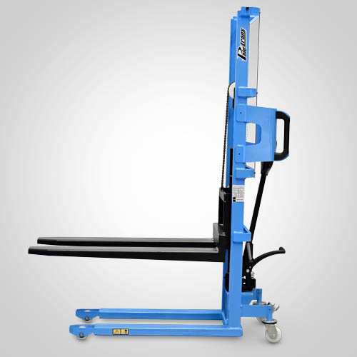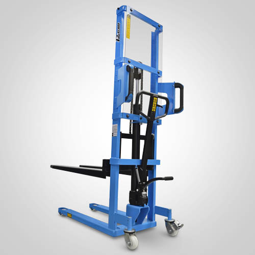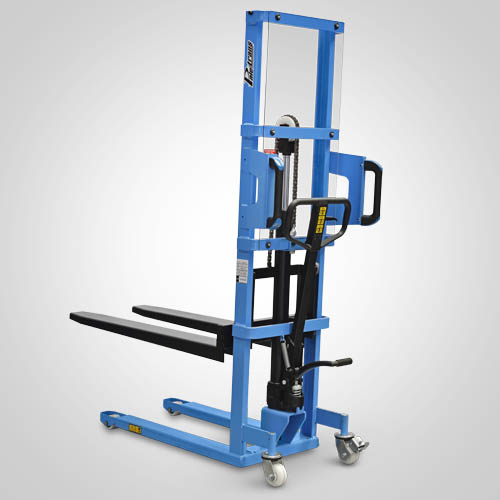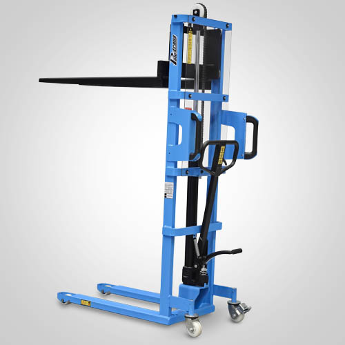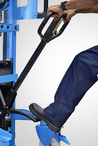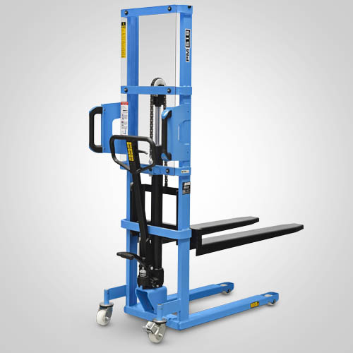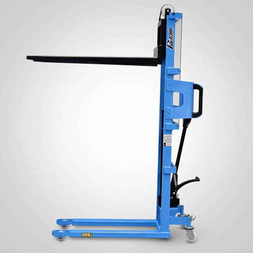 A empilhadeira manual PM516 opera exclusivamente em paletes abertos. É ideal para descarga leve de pick-ups e caminhões. A elevação do garfo é feita através do acionamento da alavanca de comando e/ou do pedal que bombeia o óleo hidráulico para dentro do conjunto e movimenta o pistão interno de elevação. O abaixamento do garfo é feito por acionamento manual do gatilho localizado no timão de comando. A empilhadeira PM516 Paletrans possui manutenção extremamente simplificada e de baixo custo. Precisa apenas de cuidados simples em seu dia a dia. Possui rodas de nylon e ótima condição de manobra, operando em corredores de até 1,90 metro de largura. A empilhadeira PM516 Paletrans é de operação muito segura e não necessita de cursos e certificações para o seu manuseio. Tem capacidade de carga de 500 quilos e elevação máxima de 1,60 metro.