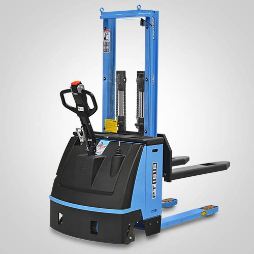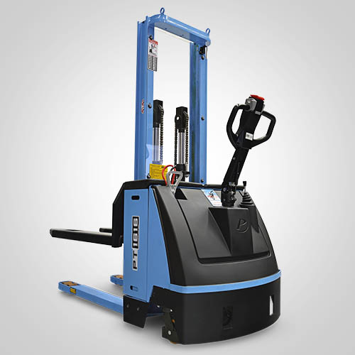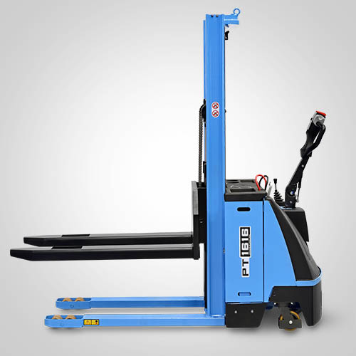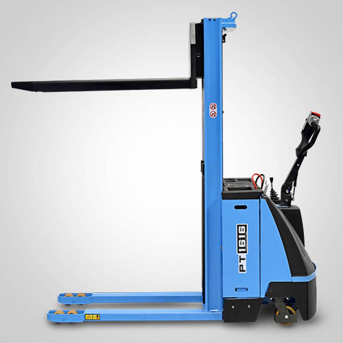 A empilhadeira elétrica patolada PT1616 tem tração e elevação por acionamento elétrico. Nesta linha, existe a possibilidade de instalar uma plataforma opcional para operador em pé, a bordo. É patolada e opera exclusivamente em paletes abertos e é ideal para almoxarifados e carga e descarga de caminhões e camionetes. A elevação do garfo é feita pelo acionamento da alavanca, que bombeia o óleo hidráulico para o conjunto e movimenta o pistão interno de elevação. Com isso, essa operação de elevação não necessita esforço do operador. A empilhadeira PT1616 Paletrans possui manutenção extremamente simplificada e de baixo custo. Precisa apenas de cuidados simples em seu dia a dia. Possui rodas de de carga em poliuretano e ótima condição de manobra, operando em corredores de até 2,28 metros de largura. Seu suprimento de energia é através de uma bateria tracionária. Desta forma, a empilhadeira pode operar em três turnos, apenas trocando a bateria por uma recarregada. Para o recarregamento da bateria, é necessário um carregador para bateria tracionária. Tem capacidade de carga de 1.600 quilos e elevação máxima de 1,60 metro.
