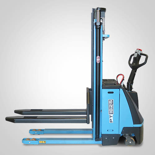 A empilhadeira elétrica patolada PT1625 tem tração e elevação por acionamento elétrico. Nesta linha, existe a possibilidade de instalar uma plataforma opcional para operador em pé, a bordo. É patolada e opera exclusivamente em paletes abertos e é ideal para almoxarifados e carga e descarga de caminhões e camionetes. A elevação do garfo é feita pelo acionamento da alavanca, que bombeia o óleo hidráulico para o conjunto e movimenta o pistão interno de elevação. Com isso, essa operação de elevação não necessita esforço do operador. A empilhadeira PT1625 Paletrans possui manutenção extremamente simplificada e de baixo custo. Precisa apenas de cuidados simples em seu dia a dia. Possui rodas de de carga em poliuretano e ótima condição de manobra, operando em corredores de até 2,28 metros de largura. Seu suprimento de energia é através de uma bateria tracionária. Desta forma, a empilhadeira pode operar em três turnos, apenas trocando a bateria por uma recarregada. Para o recarregamento da bateria, é necessário um carregador para bateria tracionária. Tem capacidade de carga de 1.600 quilos e elevação máxima de 2,50 metro.
