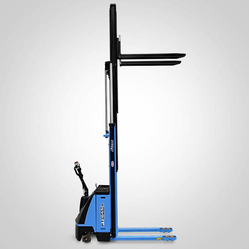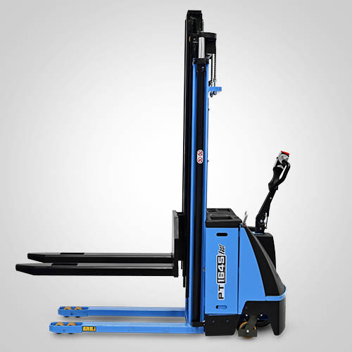 A empilhadeira elétrica patolada PT1645 Fast tem velocidade de elevação 30% maior do que a linha PT tradicional. Nesta linha, existe a possibilidade de instalar uma plataforma opcional para operador em pé, a bordo. É patolada e opera exclusivamente em paletes abertos e é ideal para almoxarifados e carga e descarga de caminhões e camionetes. A elevação do garfo é feita através do acionamento de comando elétrico que bombeia o óleo hidráulico para dentro do conjunto e movimenta o pistão interno de elevação. Com isso, essa operação de elevação não necessita esforço do operador. A empilhadeira PT1645 Fast Paletrans possui manutenção extremamente simplificada e de baixo custo. Precisa apenas de cuidados simples em seu dia a dia. Possui rodas de carga em poliuretano e ótima condição de manobra, operando em corredores de até 2,28 metros de largura. Seu suprimento de energia é através de uma bateria tracionária. Desta forma, a empilhadeira pode operar em três turnos, apenas trocando a bateria por uma recarregada. Para o recarregamento da bateria, é necessário um carregador para bateria tracionária. Tem capacidade de carga de 1.600 quilos e elevação máxima de 4,50 metros.