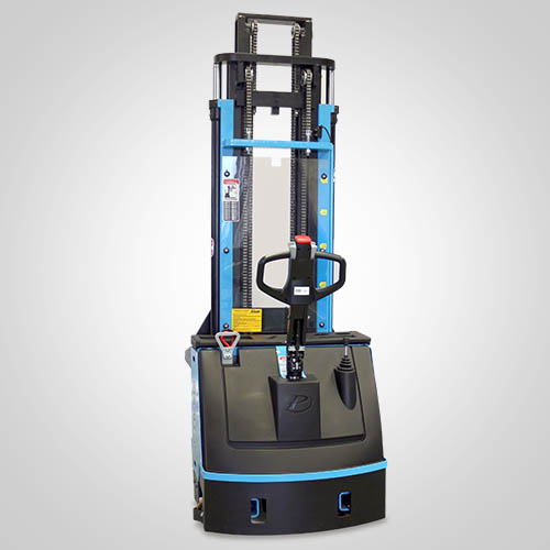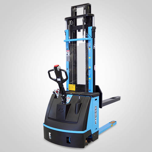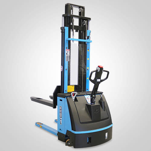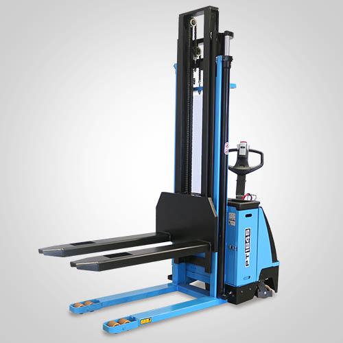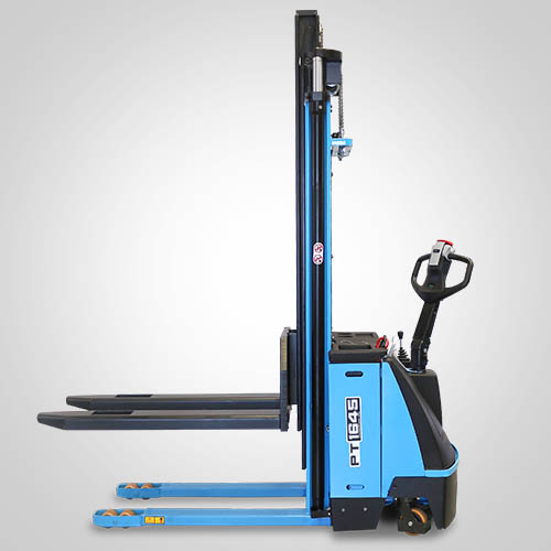A empilhadeira elétrica patolada PT1645 tem tração e elevação por acionamento elétrico. Nesta linha, existe a possibilidade de instalar uma plataforma opcional para operador em pé, a bordo. É patolada e opera exclusivamente em paletes abertos e é ideal para almoxarifados e carga e descarga de caminhões e camionetes. A elevação do garfo é feita pelo acionamento da alavanca, que bombeia o óleo hidráulico para o conjunto e movimenta o pistão interno de elevação. Com isso, essa operação de elevação não necessita esforço do operador. A empilhadeira PT1645 Paletrans possui manutenção extremamente simplificada e de baixo custo. Precisa apenas de cuidados simples em seu dia a dia. Possui rodas de de carga em poliuretano e ótima condição de manobra, operando em corredores de até 2,28 metros de largura. Seu suprimento de energia é através de uma bateria tracionária. Desta forma, a empilhadeira pode operar em três turnos, apenas trocando a bateria por uma recarregada. Para o recarregamento da bateria, é necessário um carregador para bateria tracionária. Tem capacidade de carga de 1.600 quilos e elevação máxima de 4,50 metro.