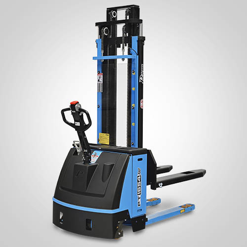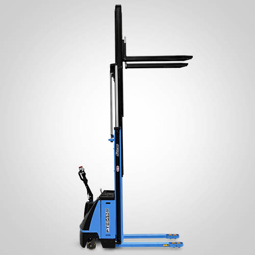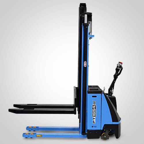 A empilhadeira elétrica patolada PT1654 Fast tem velocidade de elevação 30% maior do que a linha PT tradicional. Nesta linha, existe a possibilidade de instalar uma plataforma opcional para operador em pé, a bordo. É patolada e opera exclusivamente em paletes abertos e é ideal para almoxarifados e carga e descarga de caminhões e camionetes. A elevação do garfo é feita através do acionamento de comando elétrico que bombeia o óleo hidráulico para dentro do conjunto e movimenta o pistão interno de elevação. Com isso, essa operação de elevação não necessita esforço do operador. A empilhadeira PT1654 Fast Paletrans possui manutenção extremamente simplificada e de baixo custo. Precisa apenas de cuidados simples em seu dia a dia. Possui rodas de carga em poliuretano e ótima condição de manobra, operando em corredores de até 2,28 metros de largura. Seu suprimento de energia é através de uma bateria tracionária. Desta forma, a empilhadeira pode operar em três turnos, apenas trocando a bateria por uma recarregada. Para o recarregamento da bateria, é necessário um carregador para bateria tracionária. Tem capacidade de carga de 1.600 quilos e elevação máxima de 5,40 metros.