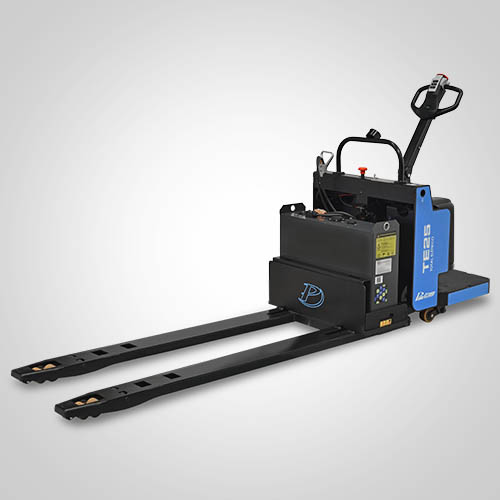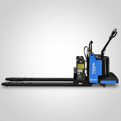 O transpalete elétrico TE25 com direção elétrica é um equipamento para movimentar cargas em grandes armazéns, depósitos e centros de distribuição. A linha de transpaletes elétricos TE25 Paletrans tem tração e elevação por acionamento elétrico com operador em pé, a bordo. A elevação é feita por comando eletrônico, e a tração elétrica, tanto frente quanto ré, é feita por meio do acelerador no timão do equipamento. Tudo isso para garantir todo o conforto sem exigir esforço do operador. O transpalete elétrico TE25 Paletrans é fabricado com os melhores componentes do mundo. Seus controladores, motores de tração e elevação são reconhecidos internacionalmente. Além disso, possuem manutenção extremamente simplificada e de baixo custo. Seu suprimento de energia é feito por meio de uma bateria tracionária. Dessa forma, a empilhadeira pode operar em três turnos, apenas trocando a bateria por outra carregada. Para a recarga da bateria, é necessário um carregador. Tem garfo com comprimento útil de 2.400 mm, capacidade de carga de 2.500 quilos e elevação máxima de 230 mm.